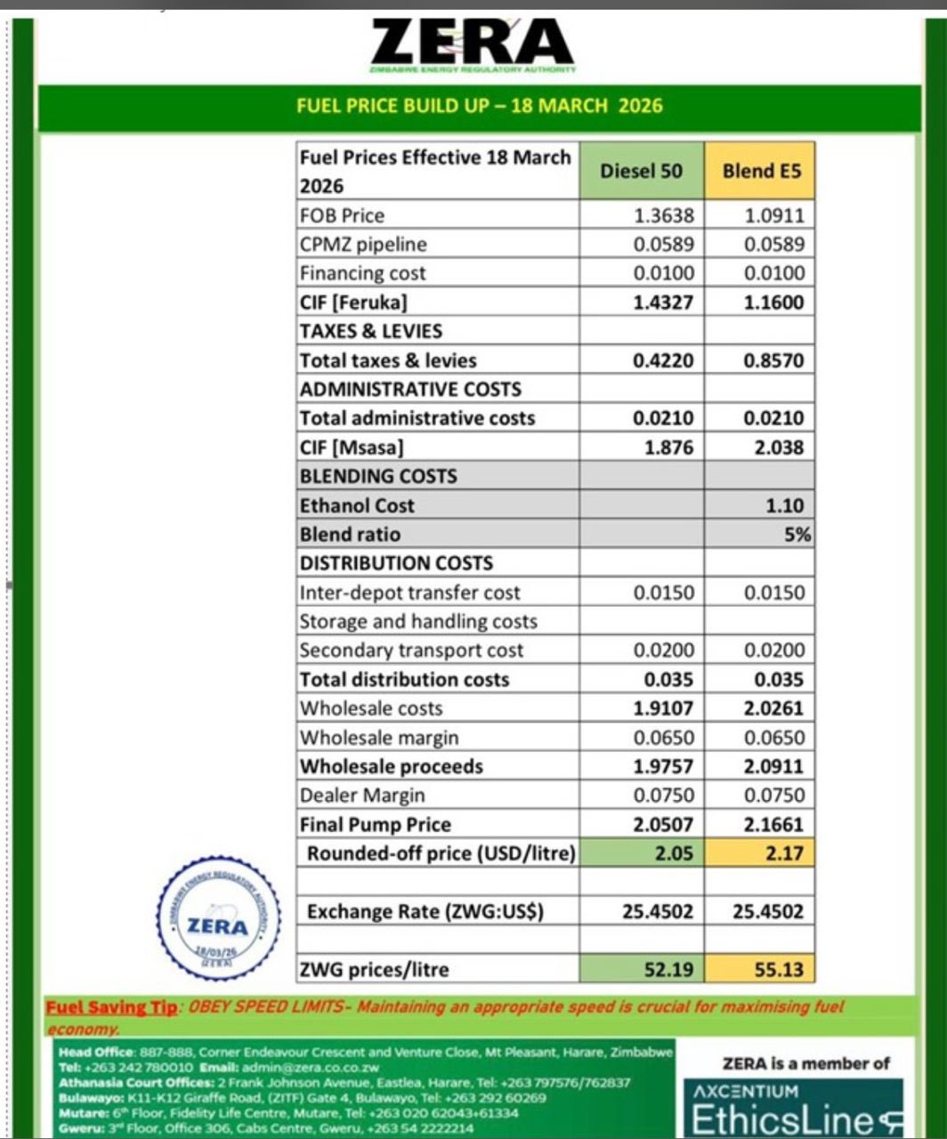 The Zimbabwe Energy Regulatory Authority (ZERA) increased the price of both diesel and petrol blend, effective 18 March, citing mounting cost pressures and the need to prevent fuel shortages and arbitrage.